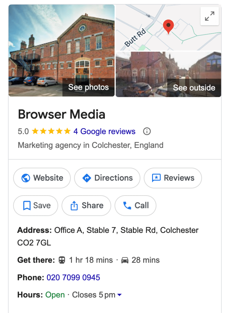 This is the information that appears on the right hand side of Google’s search results about a company. It is free to claim and update, allowing you to manage how your business shows up on Maps and Search.
