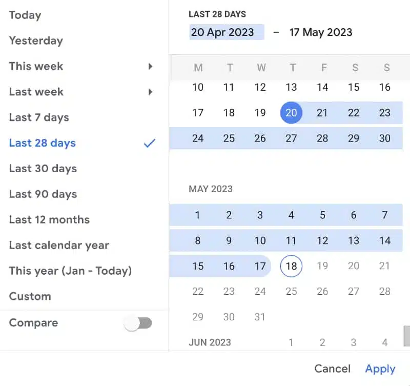 If I had to take a guess at what one of the top date selections that marketers will make when analysing their website’s performance, I would go for a monthly snapshot. ‘Last month’ is definitely my most frequently used date range in UA. Guess what, it doesn’t exist in GA4.