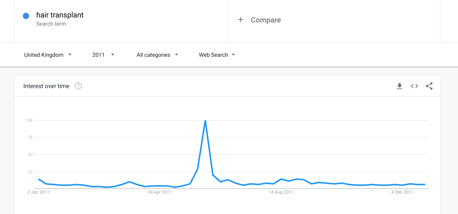 Sometimes things just happen. It’s pretty clear from this graph when Wayne Rooney’s first hair transplant created headlines and gave rise to an increase in search activity which presumably helped the industry somewhat…