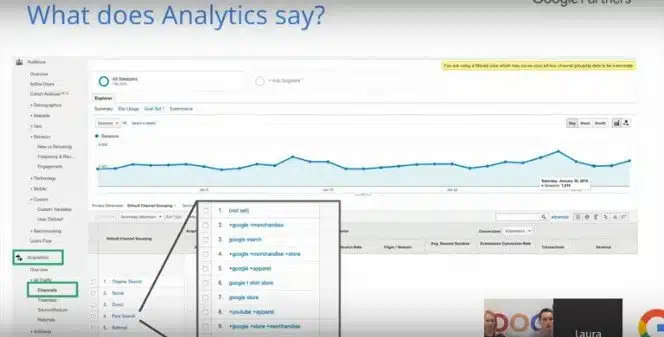 Google Analytics is a helpful way to use the past to help identify trends you might expect to see in the future. Breaking down as far as acquisition and channels can help us to see the top referring terms for not only paid search but organic search too.