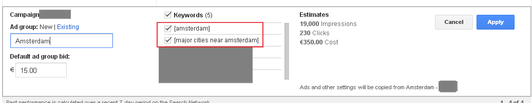 Some of the suggestions provided were appropriate, but our client provides a particular service in Amsterdam and here Google is suggesting we spend €15 per click on the term [Amsterdam] and [major cities near Amsterdam] which are not specific to the service that our client offers at all and shows that Google can get it wrong.