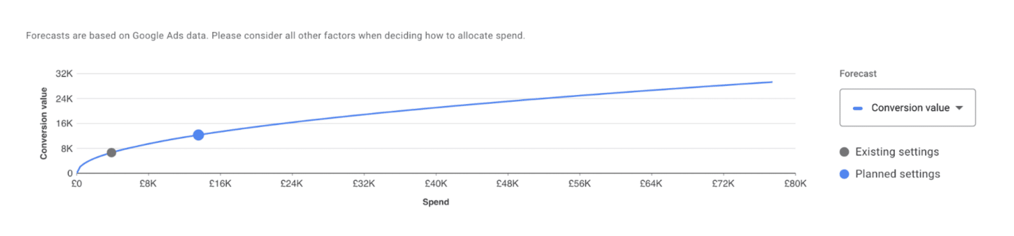 It shows how increasing/decreasing spend impacts conversion value and ROAS/CPA. So depending on your target, whether it be revenue or return on ad spend, you can use the tool to forecast how much you’d have to spend to achieve your revenue target and what ROAS you might see for that. Or if you want to achieve a particular ROAS from your campaign(s), how much you’d have to spend to hit your target.