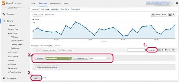 One thing to be aware of is advanced filters. By applying an advanced filter, you can find out which of your blog posts are sending the most traffic to your site, and which posts then encourage visitors to go on and interact with the rest of your site. When you set up your filter just enter the criteria you’d like to filter by (for example, ‘blog’), click apply and your data will be automatically filtered.