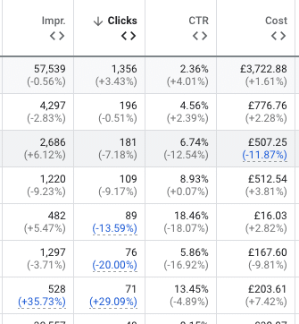 Once you have equal (in length) date ranges to compare you may see some of the percentage changes in the cost, clicks, impressions and conversions columns highlighted in blue. This means that there are explanations to explore:
