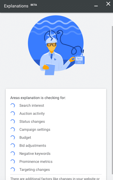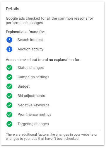 A lot of the stuff is common sense or should be known, especially if it’s as obvious as the budget being changed, although if there are multiple people working on the account I can see how this can be useful. Also, unfortunately, the explanations aren’t available for every campaign and ad group, only ones that meet the volume and change thresholds.