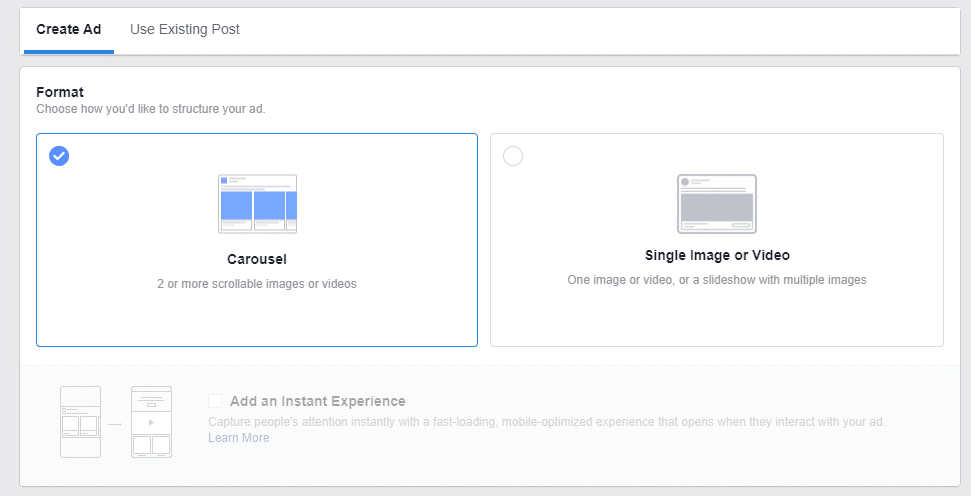You can choose to create a carousel or single image/video, depending on the assets you have available.