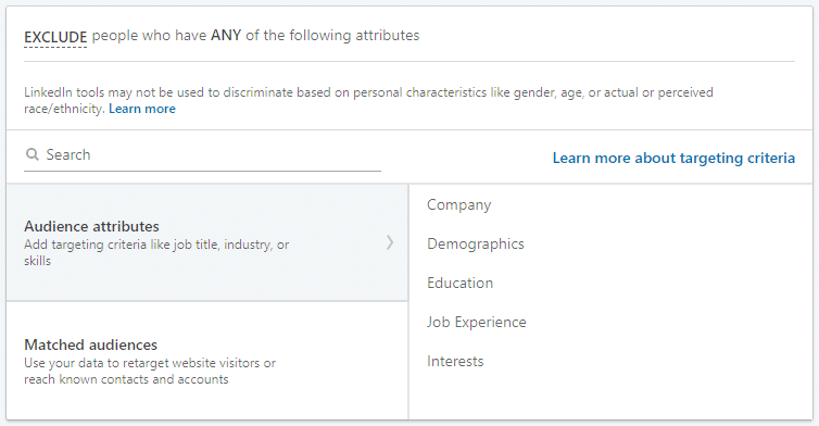 - Add exclusions where necessary – for example, if you are promoting a white paper, do you really want people who work for a competitor to see the ads?