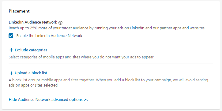 - Decide whether you want to target users outside of LinkedIn on their partner networks
