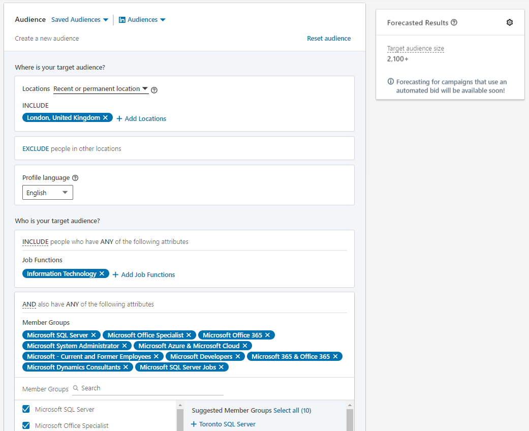 Or, build a new audience. Keep an eye on the forecasted results box as you do so to get an idea of cost and reach.