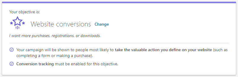Once you’ve decided on your objective, you’ll be presented with a prompt that summarises what the end goal is, and provides any additional information on what you need to do in order for the campaign to run properly.