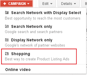 In order to set up a Shopping campaign simply log in to AdWords, hit the red +Campaign button and choose ‘Shopping’.