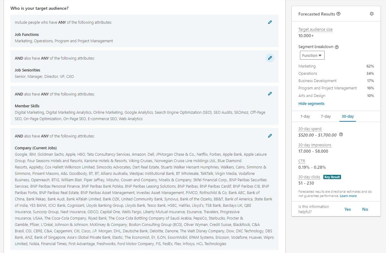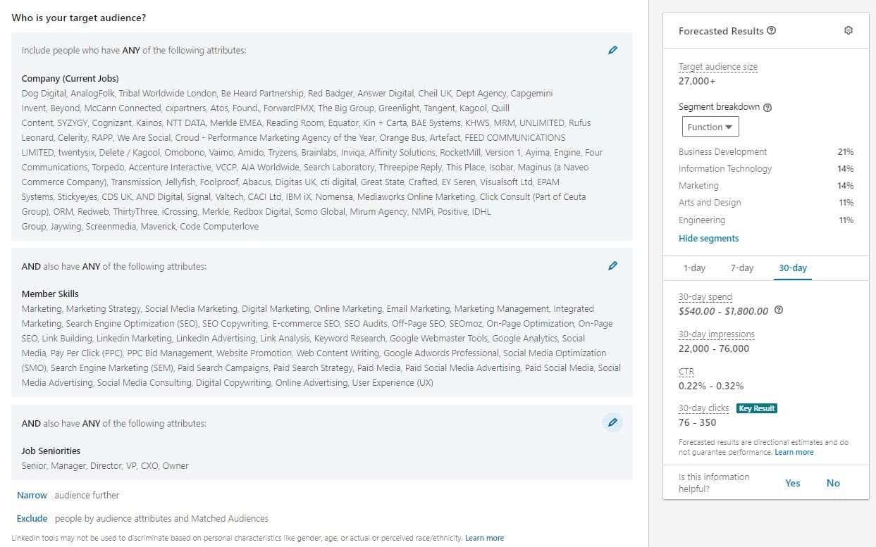 If this is the case, or you’re not sure of the job titles, you can use a combination of job function and seniority, plus member skills (if the audience is still too large) instead. This approach can sometimes work better than job titles if you aren’t sure who the decision makers are.