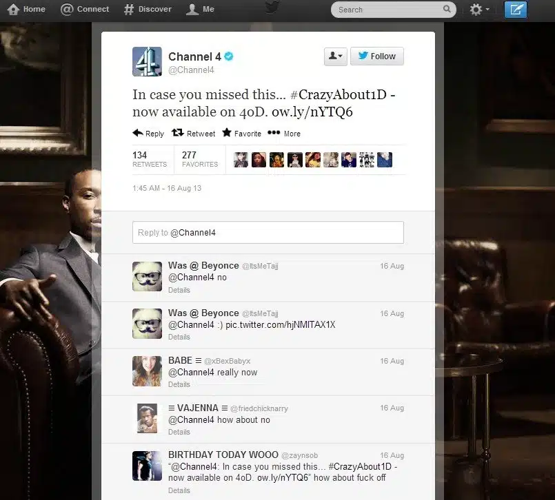 But it isn’t just video games that seem to provoke such toxic behaviour. When Channel 4 aired a documentary detailing the obsessive nature of One Direction fans, these fans took to Twitter to voice their discontent in ways that seemed to only reinforce the light in which they were presented. When an as-yet unfounded rumour that the documentary caused a wildly varying number of One Direction fans to commit suicide (12? 42? 100? It depends who you ask) spread like wildfire on Twitter, Channel 4 tweeted the arrival of the film on 4OD. The fans reacted in the only way they knew how – by spouting angry messages back at Channel 4.