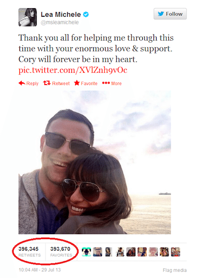Monteith’s girlfriend Lea Michele’s tweet regarding his death had over 396,000 retweets and 393,000 favourites. Fellow Glee star Michele had kept quiet for two weeks after his death, but her first public statement about the tragedy is the most retweeted post of 2013.