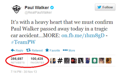 Actor Paul Walker was killed in a car crash at the end of November and the news was broken to the public through his official twitter account. The message was retweeted over 395,000 times and favourited over 100,400 times. It seem a little unsettling to me that a ‘favourite’ tweet can be one that breaks such awful news. Perhaps twitter need to jump on the Facebook ‘sympathise’ bandwagon for 2014.
