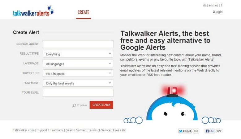 Talkwalker – Marketed as “the best free and easy alternative to Google Alerts”, Talkwalker Alerts can easily lure a user into a false sense of security by offering a system with seemingly identical features to Google Alerts. Visually and mechanically there are hardly any differences between the two services. However the quality of the alerts that Talkwalker delivers are beyond useless. The easy setup doesn’t make up for the mostly foreign, usually irrelevant and always terrible results. Avoid Talkwalker Alerts at all costs.