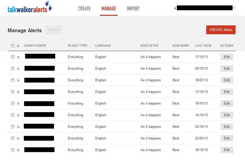 Once your alerts are created by entering the details in the relevant boxes, you can manage them by editing the details and viewing the RSS feeds. These can then be entered into an RSS reader such as Feedly, or be delivered to your email by selecting ‘Turn email delivery on’ at the bottom of the screen. Once again, the management form is the spitting image of Google’s, including the function to export the emails as a .CSV. You can also import .CSV files, so if you are migrating from Google Alerts there is an easy function to carry your alerts across. It’s all fairly self-explanatory, and if you are used to Google Alerts it is as if you never left home.