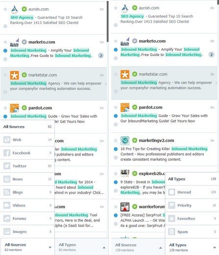 I was particularly impressed with the feed filter system as this is something I had often wanted and needed when using Feedly. The mentions feed can be filtered by source i.e. forums, twitter, facebook etc. or by type i.e. unread, spam etc. (see image ii).