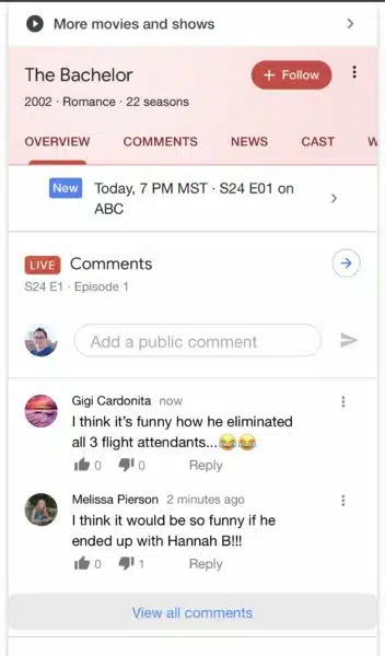 Earlier this week, Google confirmed to Search Engine Land that it is currently testing user comments in SERPs surrounding live TV shows, a feature that is currently only available for sporting events. The new feature is currently only in test phase, however, Twitter user @nikers85 has shared a screenshot of what the feature will look like.