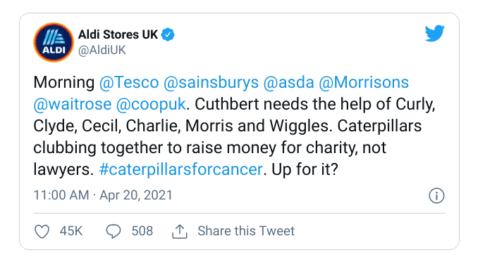 Aldi then announced that sales of its Cuthbert would raise money for two charities (a tactic also employed by M&S) and commented on social media: “Hey Marks and Spencer we’re taking a stand against caterpillar cruelty. Can Colin and Cuthbert be besties?”.