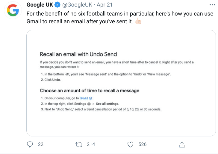 Although Google didn’t mention the ‘six football teams’ by name, the tweet gave advice to anyone (or any football team for that matter), who might want to change their mind having hit the ‘send’ button