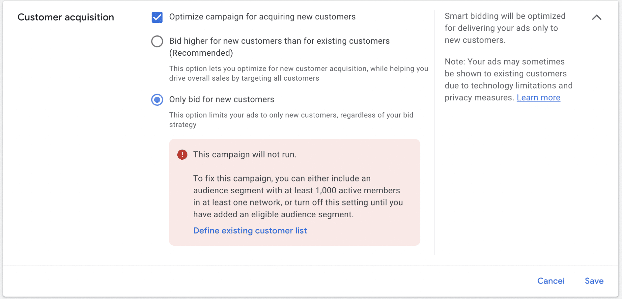 The feature uses Smart bidding and first-party data to help advertisers get in front of new prospective customers. Google recommends pairing this goal setting with bid strategies such as maximise conversion with target ROAS (where applicable), to try and find those new customers that will add the most value to your business.
