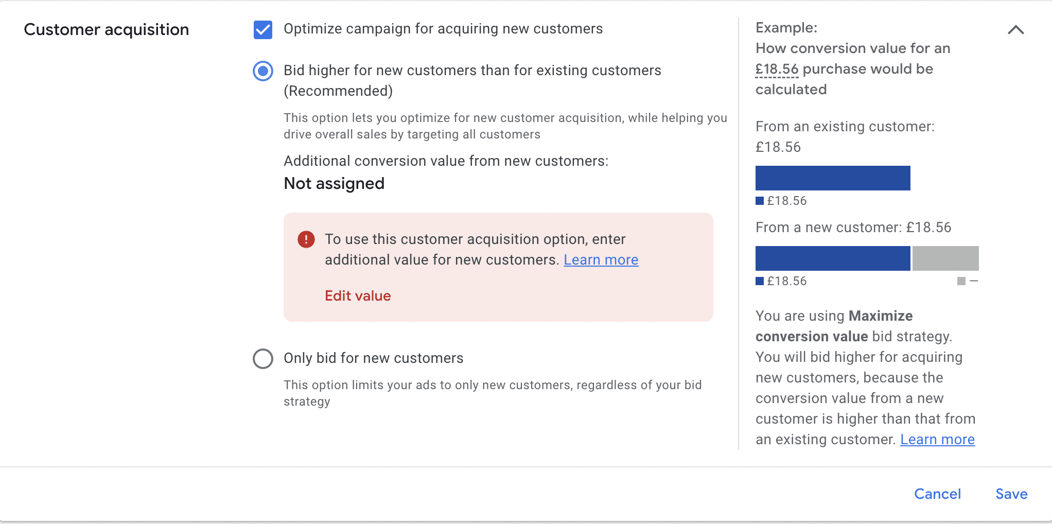 - Value New Customer – “Bid higher for new customers than for existing customers.” The advertiser must choose an additional value for a new customer:
