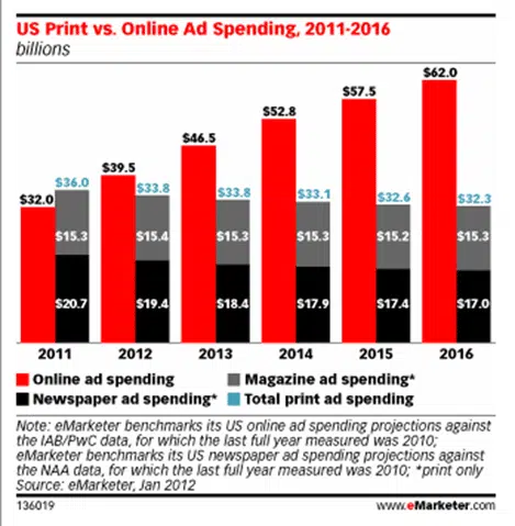 It has been revealed in a report carried out by eMarketer that ad spend in the US will surpass that spent on print advertising in 2012, reaching nearly $40 billion, a 23.3% growth from 2011.