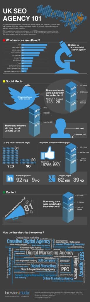 Our infographic summarises the current state of our industry, highlighting the services agencies offer, how they describe themselves, their content output and social media media use in an attempt to capture the current state of search at this exciting point for the industry.