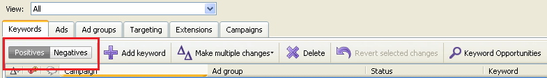 If you choose to use AdWords Editor, go to the Keywords section and change from Positives to Negatives: