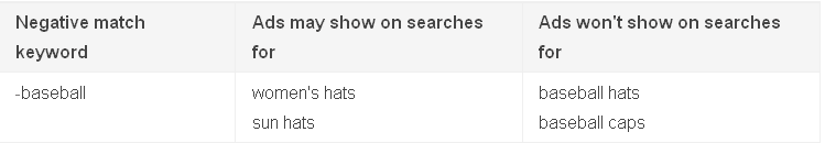 This means that if an advertiser sells hats and caps and they are bidding on the terms “hats” and “caps” but do not sell baseball hats or caps, then they can add ‘-baseball’ as a negative keyword and then their ads will not show to people searching for ‘baseball hats’ or ‘baseball caps’.