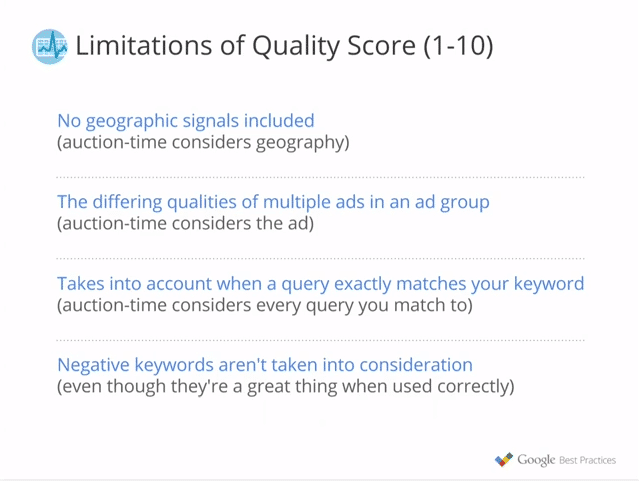 In the video Sean explains how every time an ad is shown Google judges its ‘auction-time quality’ which takes a lot more into consideration than the QS calculation does. This takes into account; query, device, time of day and user location. Google uses all those things to rank your ad, on top of QS, therefore the 1-10 score that Google gives your keywords is very limited: