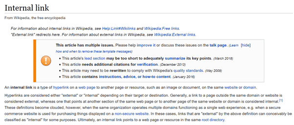 In Wikipedia’s page on internal linking (as I said, there’s a page for everything), within the first line, it links out to more information on hyperlinks, web pages, websites and domains. Obviously, if I did that in this blog post, it would be unnecessary, and quite frankly patronising, but as this opening paragraph begins by explaining what an internal link is, it makes sense to give explanations for these related terms too. Plus, if you’re looking up internal links on Wikipedia, it’s probably fair to say that it isn’t your day job.