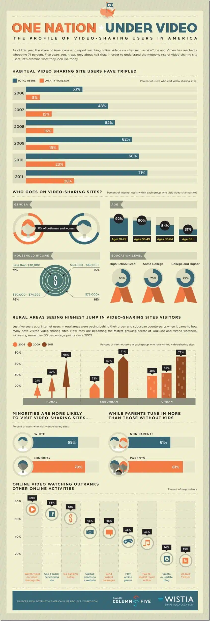 The infographic shows that since 2006 the number of internet users (U.S. only) visiting video sites has risen from 33% to 71% and that on a ‘typical day’, 28% of users will visit a video sharing site – a figure 20% higher than back in 2006.